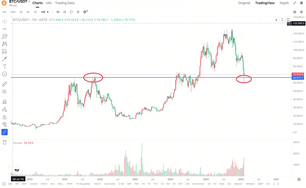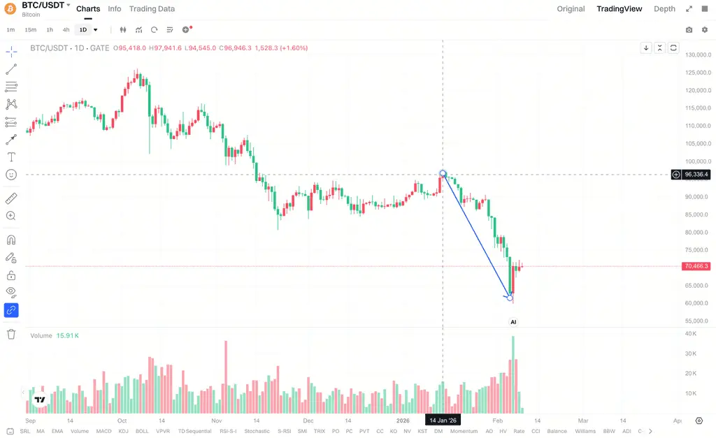 من الناحية النتائج، فإنها موجة هبوط من نوع الاتجاهي المعتاد. وفقًا لبيانات Gate.com، دخل البيتكوين في قناة هبوط واضحة منذ 14 يناير 2026، حيث استمر في الانخفاض من 97,941 دولارًا، ووصل إلى أدنى مستوى عند 59,980 دولارًا في 6 فبراير. وبمقارنة ذلك مع أعلى مستوى تاريخي سجله في 6 أكتوبر 2025 عند 124,659 دولارًا، فإن الانخفاض الإجمالي للبيتكوين قد بلغ 51.8%.
