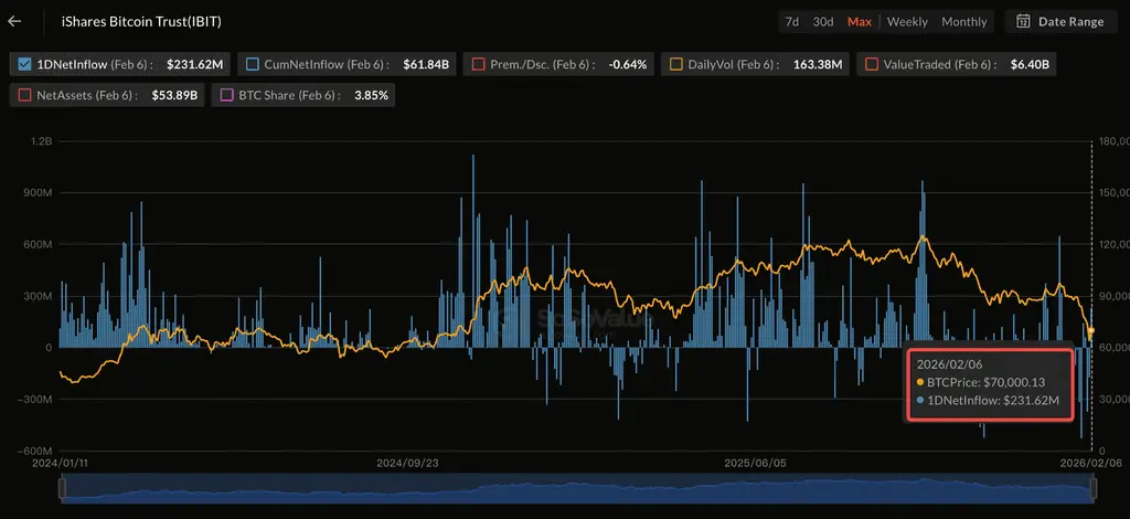 في 6 فبراير، سجل منتج ETF الفوري للبيتكوين IBIT أعلى حجم تداول تاريخي، حيث تجاوز حجم التداول اليومي 10 مليارات دولار، وحقق حجم خيارات أيضًا أرقامًا قياسية. من الناحية النظرية، ينبغي أن يصاحب هذا الانخفاض الحاد في السعر عمليات سحب واسعة من ETF، لكن الواقع كان عكس ذلك، حيث سجل السوق صافي طلبات شراء.