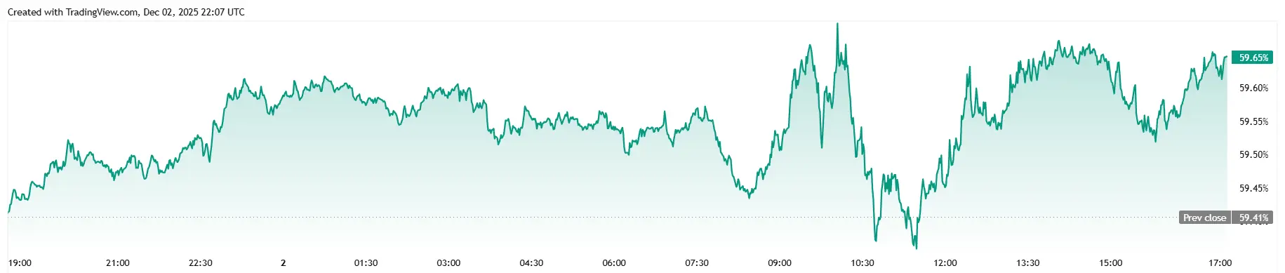 1日あたりの取引高は10.3%減の$77.97億となり、時価総額は$1.92兆まで上昇。ビットコインのドミナンスも0.42%上昇し、執筆時点で59.65%に達した。