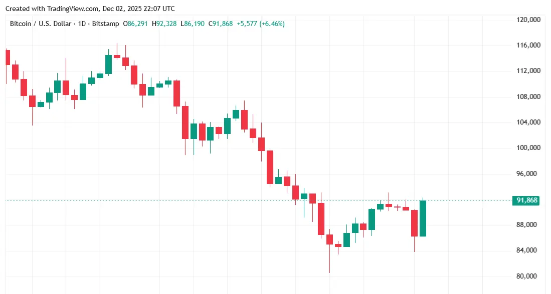 ビットコインは記事執筆時点で$91,767.67で取引され、当日比6.03%、週間で5.88%上昇していた。市場データによれば、BTC価格は24時間で$86,202.19〜$92,316.63の間で大きく変動し、ボラティリティは依然高いままだ。
