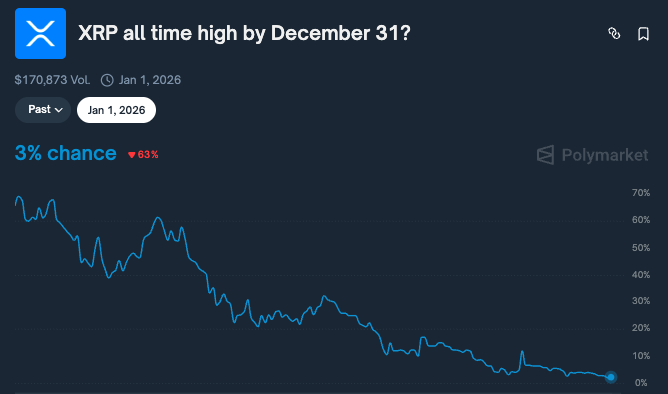 年末が近づく中、予測市場はXRPが12月31日までに過去最高値を更新する可能性はごくわずかであることを示唆しています。