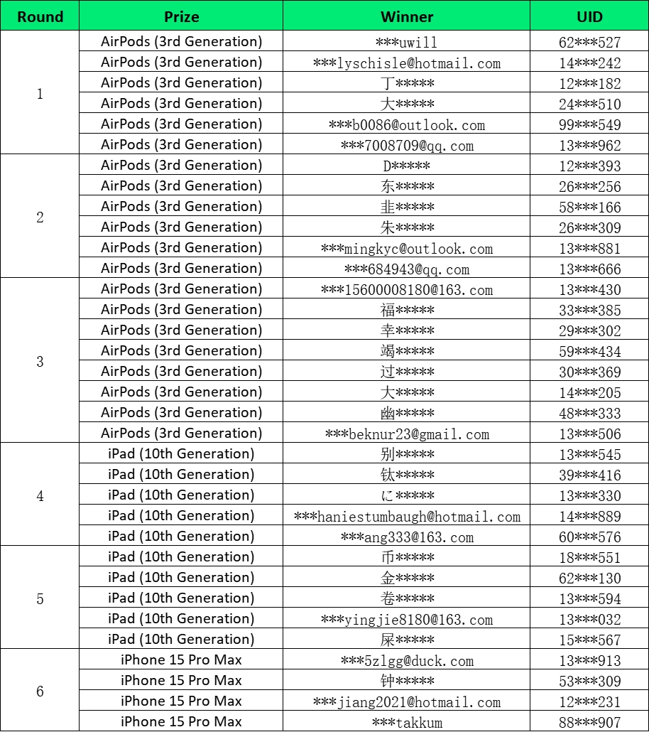 A terceira rodada da loteria ao vivo WCTC S5 foi realizada com sucesso. Obrigado a todos pelo apoio a este evento, e obrigado aos convidados especiais da transmissão ao vivo por trazerem alegria ao evento. Após seis rodadas de sorteios ao vivo, foram 20 traders que ganharam os AirPods (3ª Geração), e 10 traders que ganharam um iPad (10ª geração) e 4 traders que ganharam um iPhone 15 Pro Max. Parabéns!