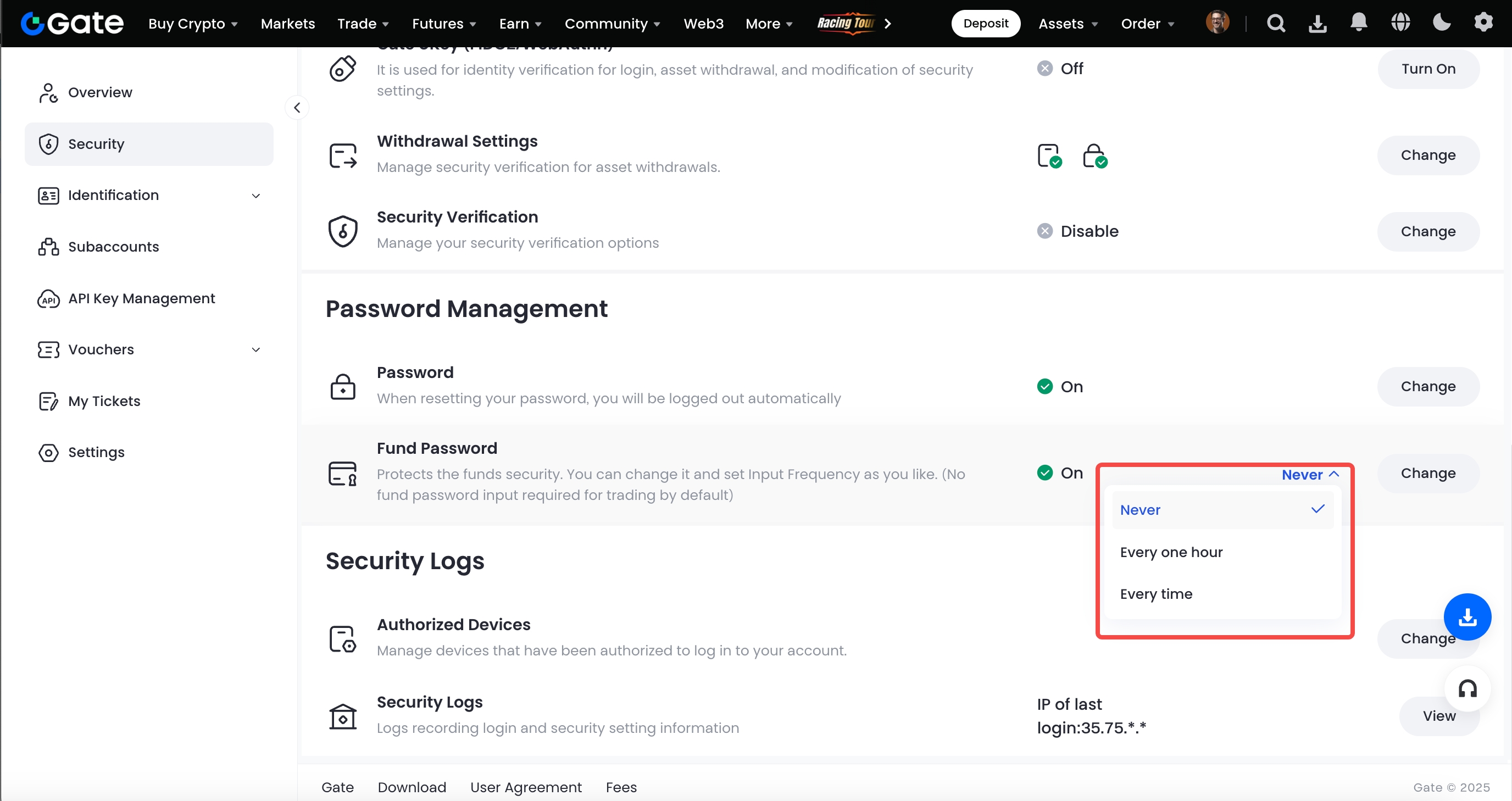 Faça login em sua conta, mova o mouse até o ícone de perfil e clique em "Verificação de Segurança" > "Gerenciar senha" > "Assinatura Eletrônica".Clique no ícone ao lado de "Alterar" e escolha entre "uma hora", "sempre" e "nunca".