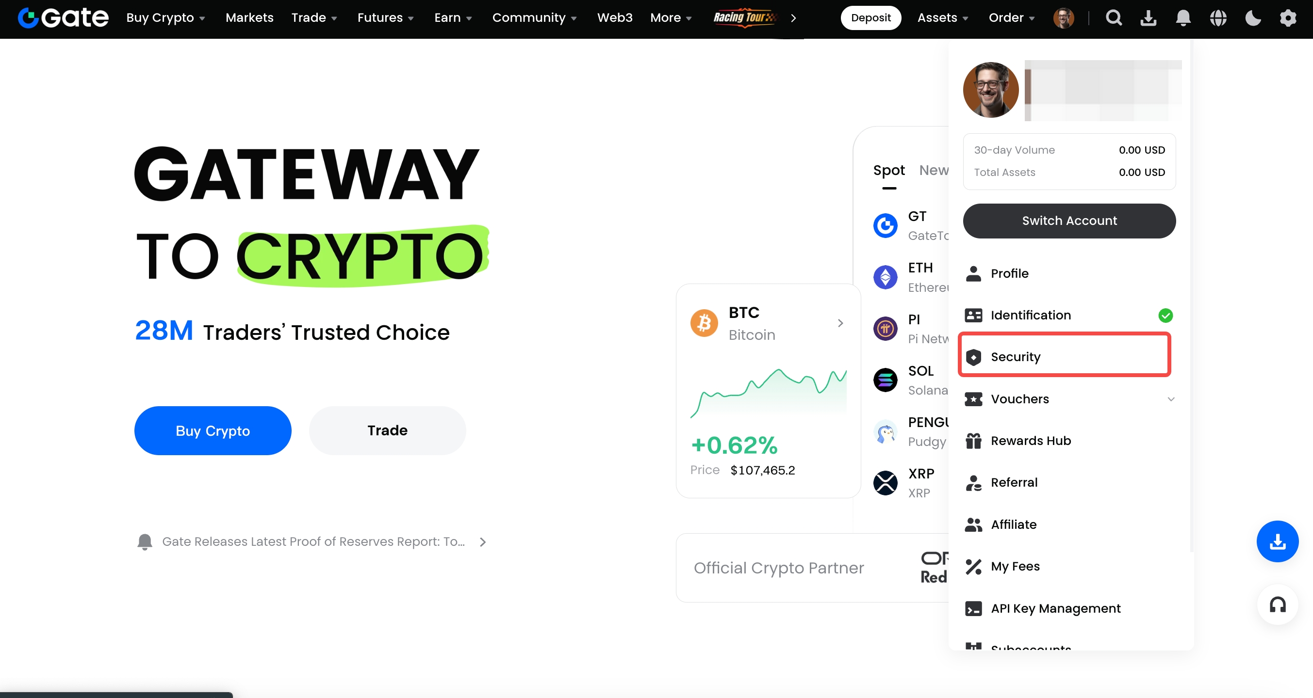 Abra a app da Gate e inicie sessão na sua conta. Clique no ícone do perfil no canto superior esquerdo e depois em "Central de Segurança" > "Assinatura eletrónica (alterar)".