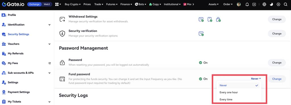 Fon şifresi varlıklarınızın güvenliği için ek koruma sağlar. Fon şifresi giriş sıklığını ihtiyaçlarınıza daha iyi uyacak şekilde ayarlayabilirsiniz (varsayılan olarak, fon şifresi saatte bir kez sorgulanacaktır, ancak IP adresi değişiklikleri varsa her zaman tekrar girilecektir).