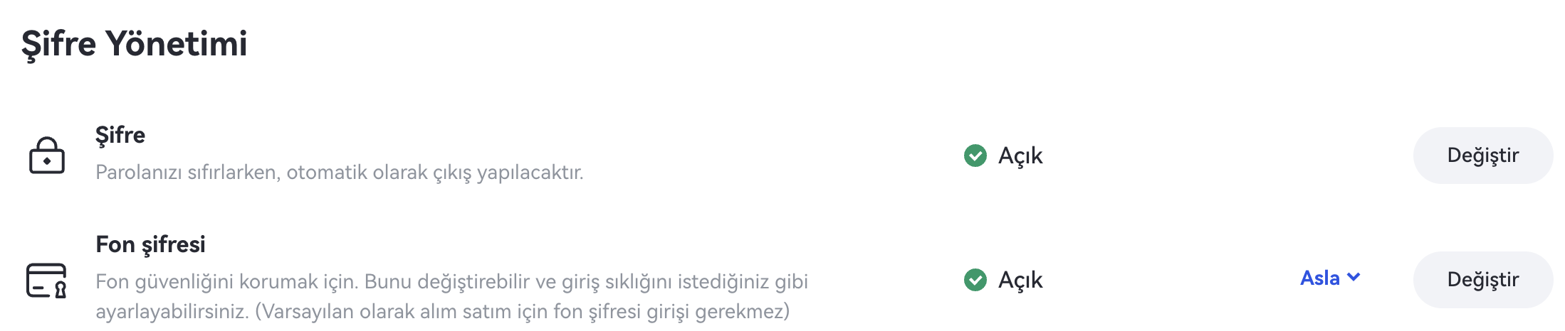 Cüzdan kilidi şifresini değiştirmek istiyorsanız, bunu Gate fon şifresini değiştirerek yapabilirsiniz.