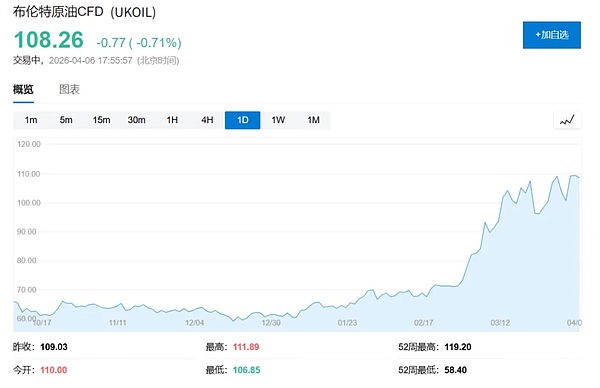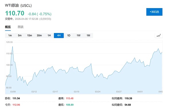 Giá dầu Brent vào thứ Hai đã vọt lên 109,77 USD/thùng, cao hơn khoảng 50% so với thời điểm chiến tranh bùng phát ngày 28 tháng 2. Giá dầu WTI (West Texas Intermediate) của Mỹ tăng còn mạnh hơn tới 66%; tính đến 11:00 tối theo giờ miền Đông Mỹ, giá là 111,2 USD.