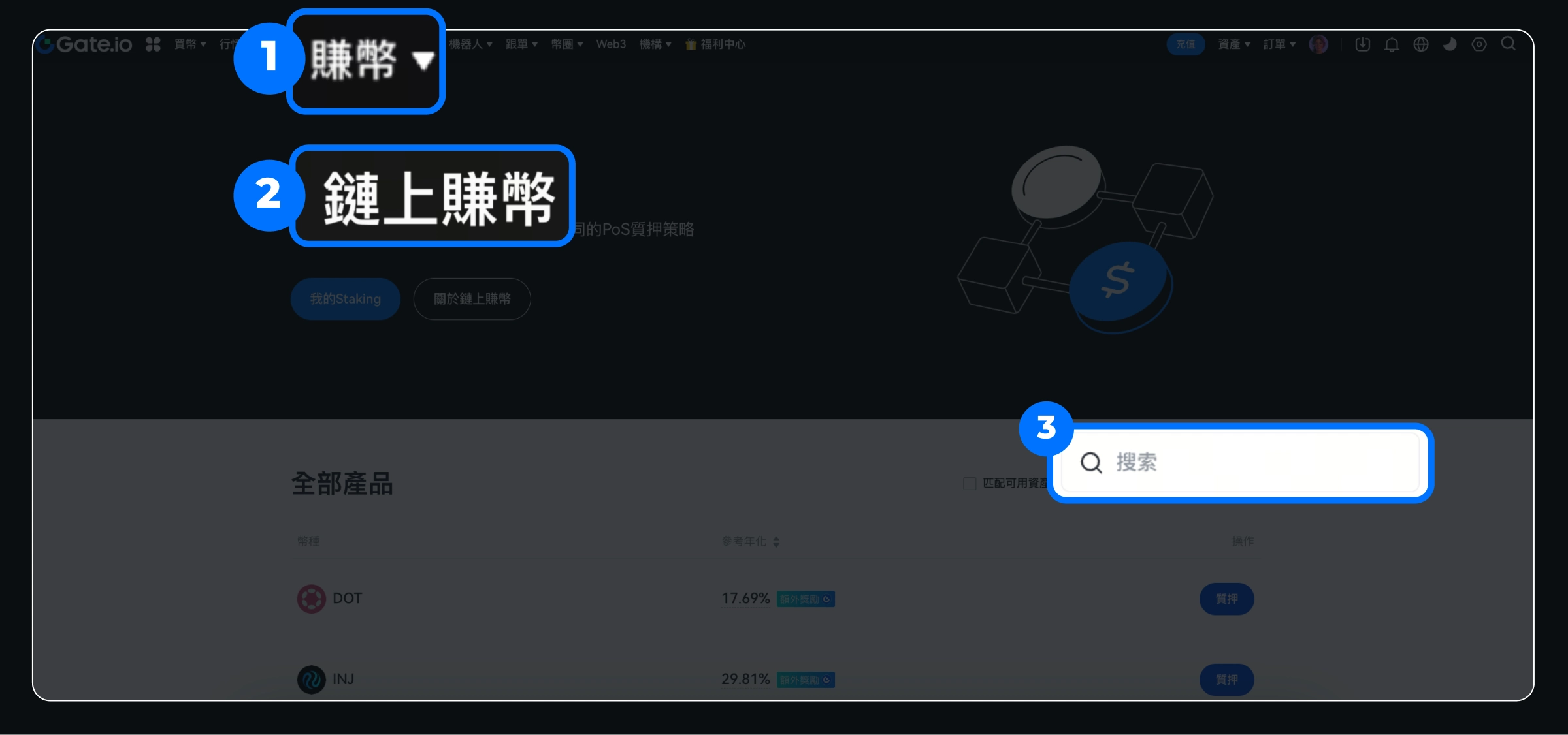 Gate 链上赚币汇集了当前多种热门的 PoS 项目,通过质押一定数量的加密资产来赚取链上高额收益。