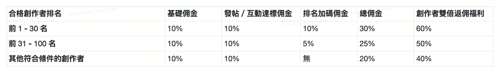 - 新創作者和回歸作者可以獲得雙倍佣金。