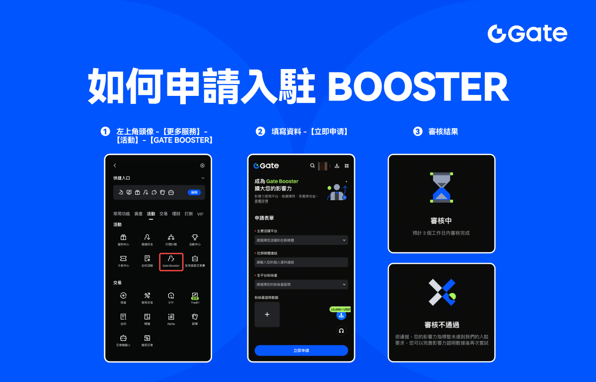 APP 端:點擊左上角頭像 -【更多服務】-【活動】- 選擇【Gate Booster】,進入頁面 mod 點擊【立即申請】。依表單填寫相應平台、個人主頁連結、粉絲數量、證明截圖,並提交申請,平台將於 3 個工作日內完成審核。