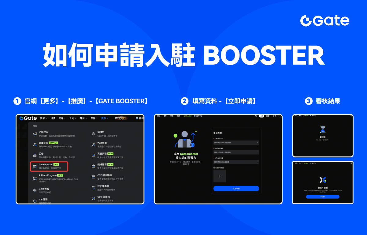 Web 端:官網導覽列【更多】-【推廣】- 選擇【Gate Booster】,進入頁面後點擊【立即申請】。依表單填寫相應平台、個人主頁連結、粉絲數量、證明截圖,並提交申請,平台將於 3 個工作日內完成審核。