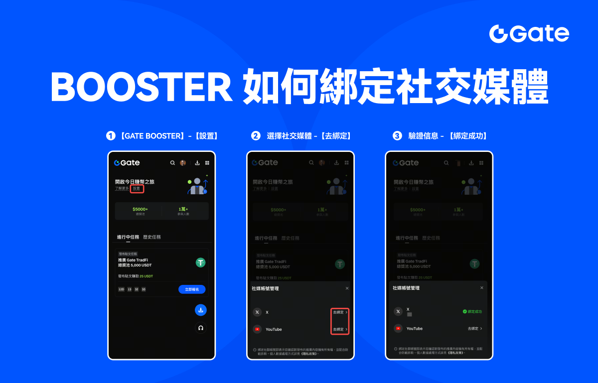 入駐成功後,KOL 可在 Web 端或 APP 端的 Booster 平台中查看最新任務。點擊【設定】進行社群帳號綁定。