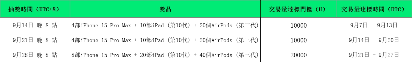 此外,9 月 14 日、 9 月 21 日、9 月 28 日每週四晚 8 點,將繼續舉行直播抽獎活動,以下是詳細時間安排: