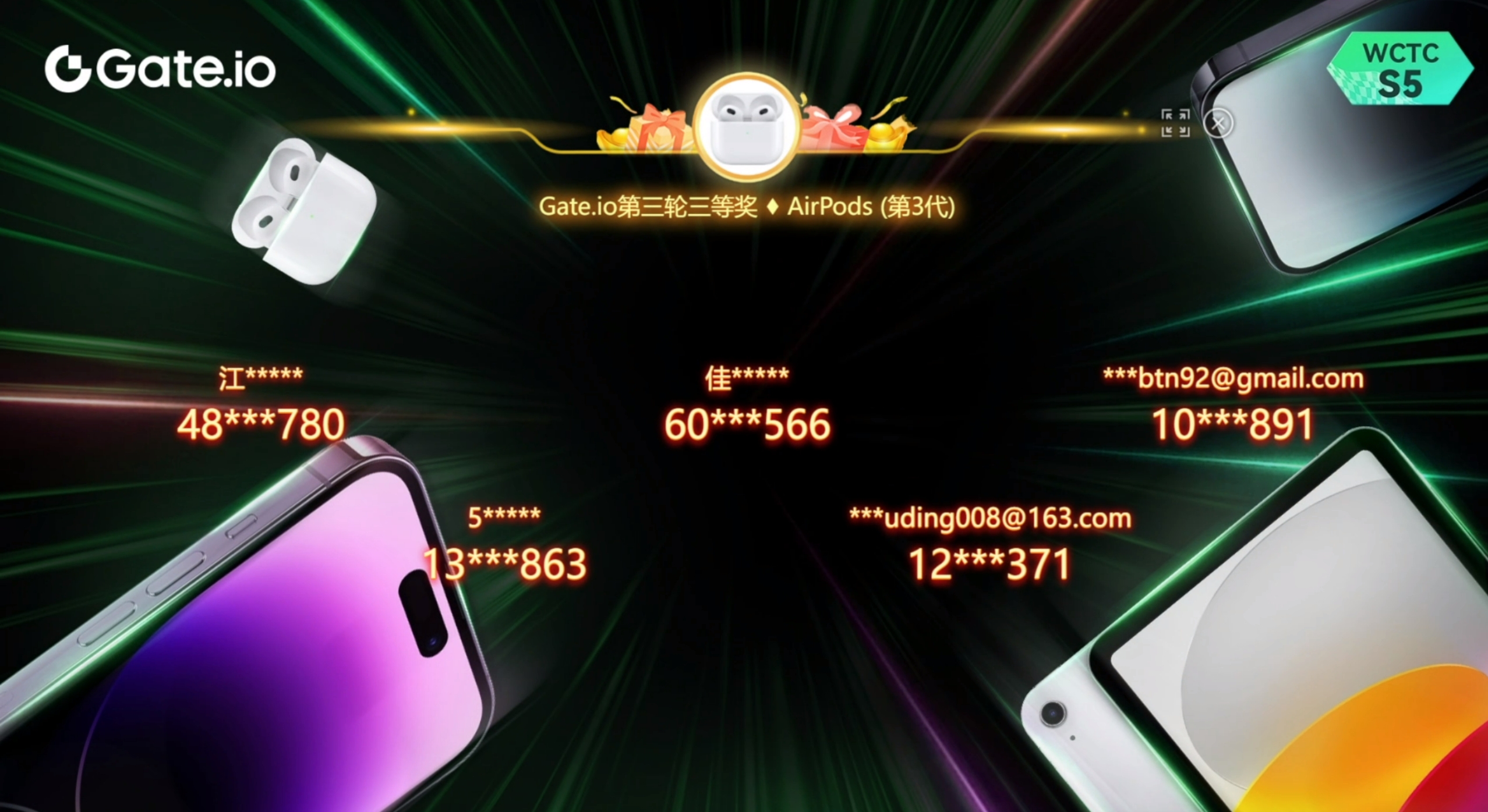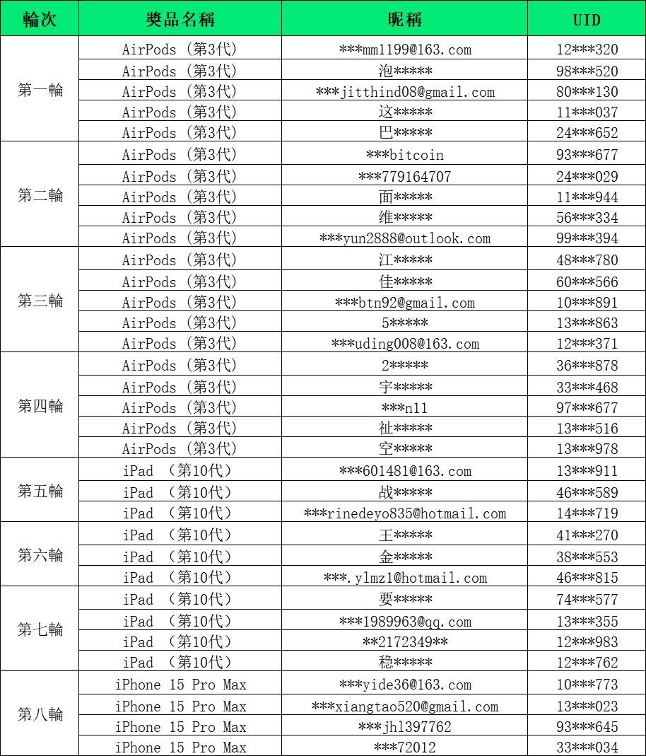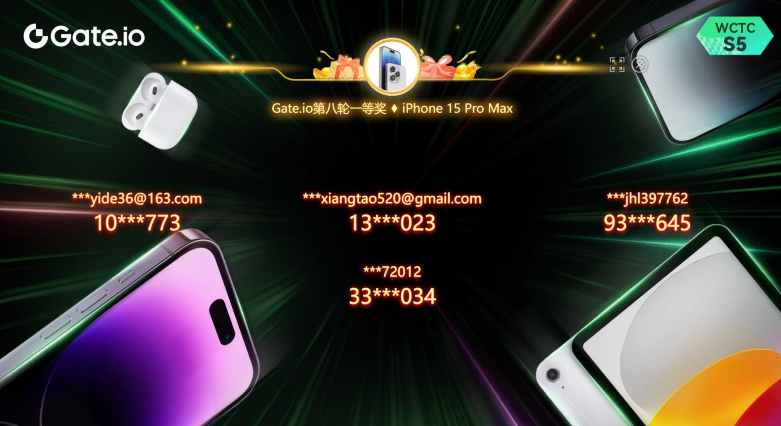 WCTC S5 重磅好禮,抽191件iPhone 15 Pro Max 等豪禮第二場直播抽獎活動已圓滿結束,感謝每一位用戶的關注與參與,同時也感謝特邀嘉賓們為我們帶來精彩的直播內容。經過八輪公開透明直播抽獎,總計20位用戶獲得AirPods (第3代),10位用戶獲得iPad(第10代),4位用戶獲得iPhone 15 Pro Max,在此恭喜獲得獎勵的幸運兒!