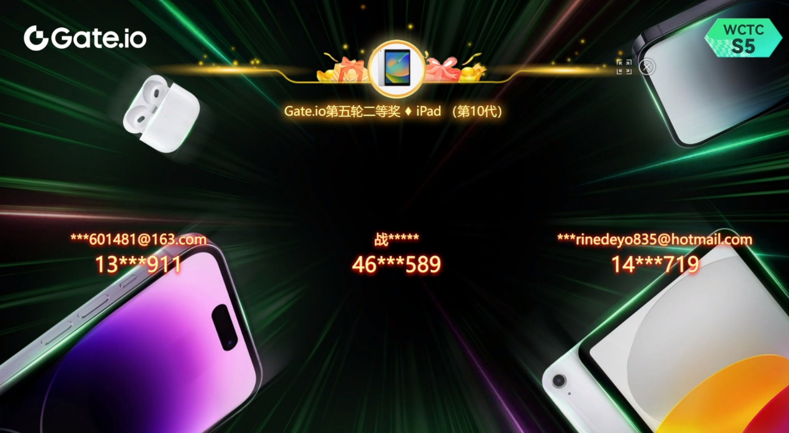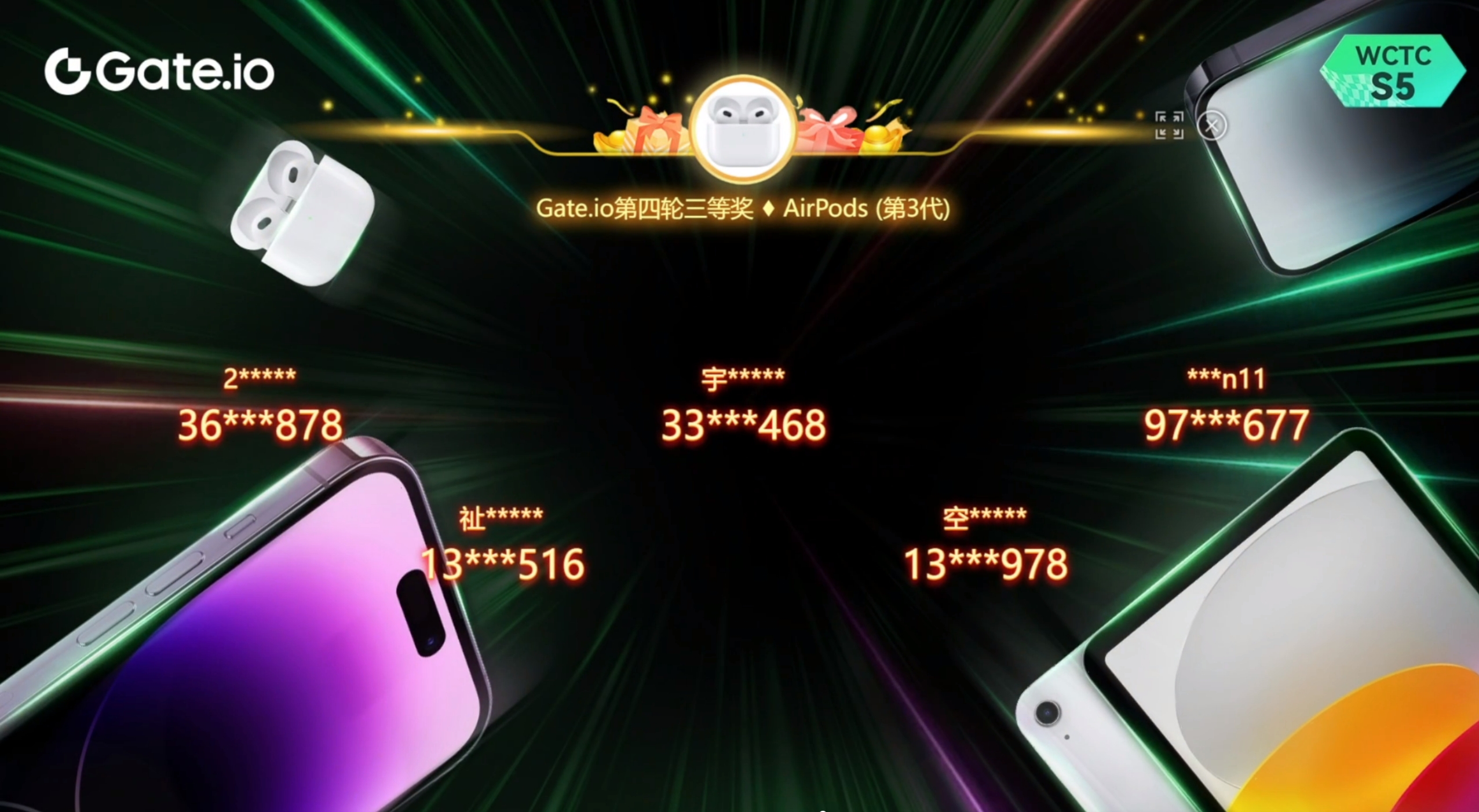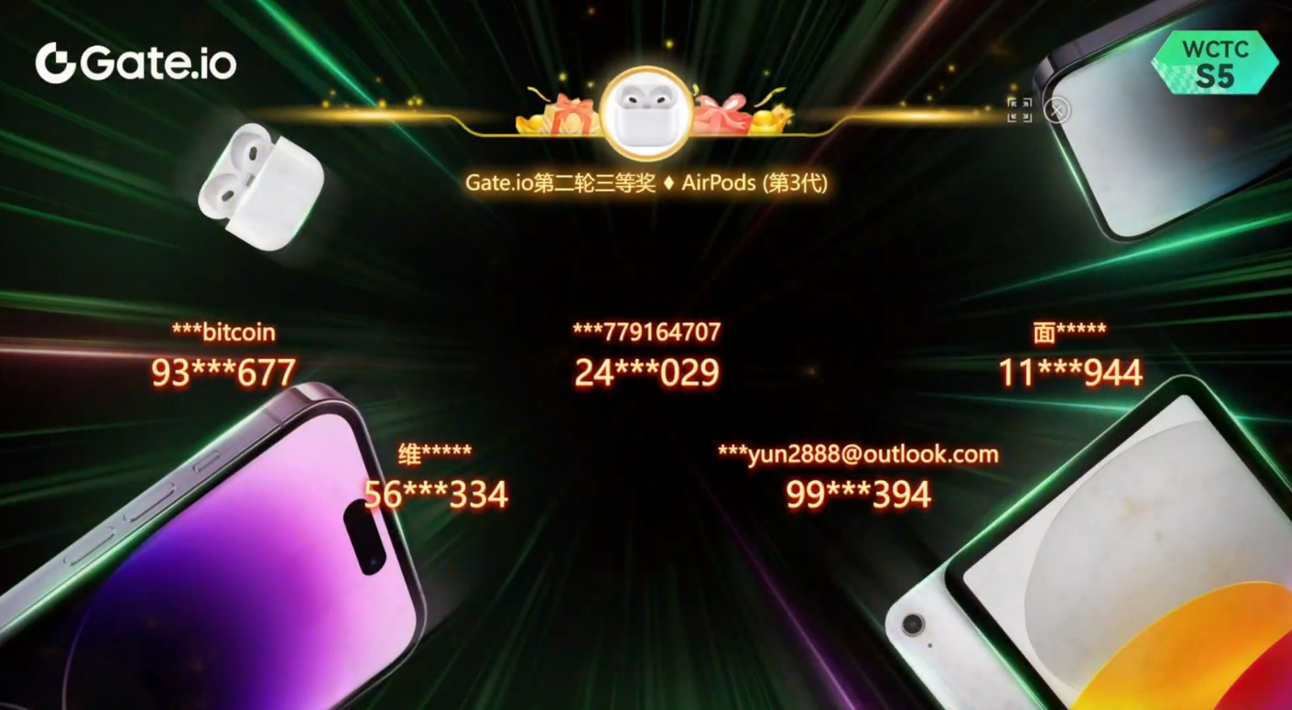 WCTC S5 重磅好禮,抽191件iPhone 15 Pro Max 等豪禮第二場直播抽獎活動已圓滿結束,感謝每一位用戶的關注與參與,同時也感謝特邀嘉賓們為我們帶來精彩的直播內容。經過八輪公開透明直播抽獎,總計20位用戶獲得AirPods (第3代),10位用戶獲得iPad(第10代),4位用戶獲得iPhone 15 Pro Max,在此恭喜獲得獎勵的幸運兒!