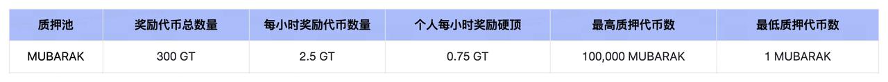 如何参与: 登录Gate账号,完成身份认证 → 进入Launchpool → 持有不低于 1 MUBARAK → 点击“质押”
