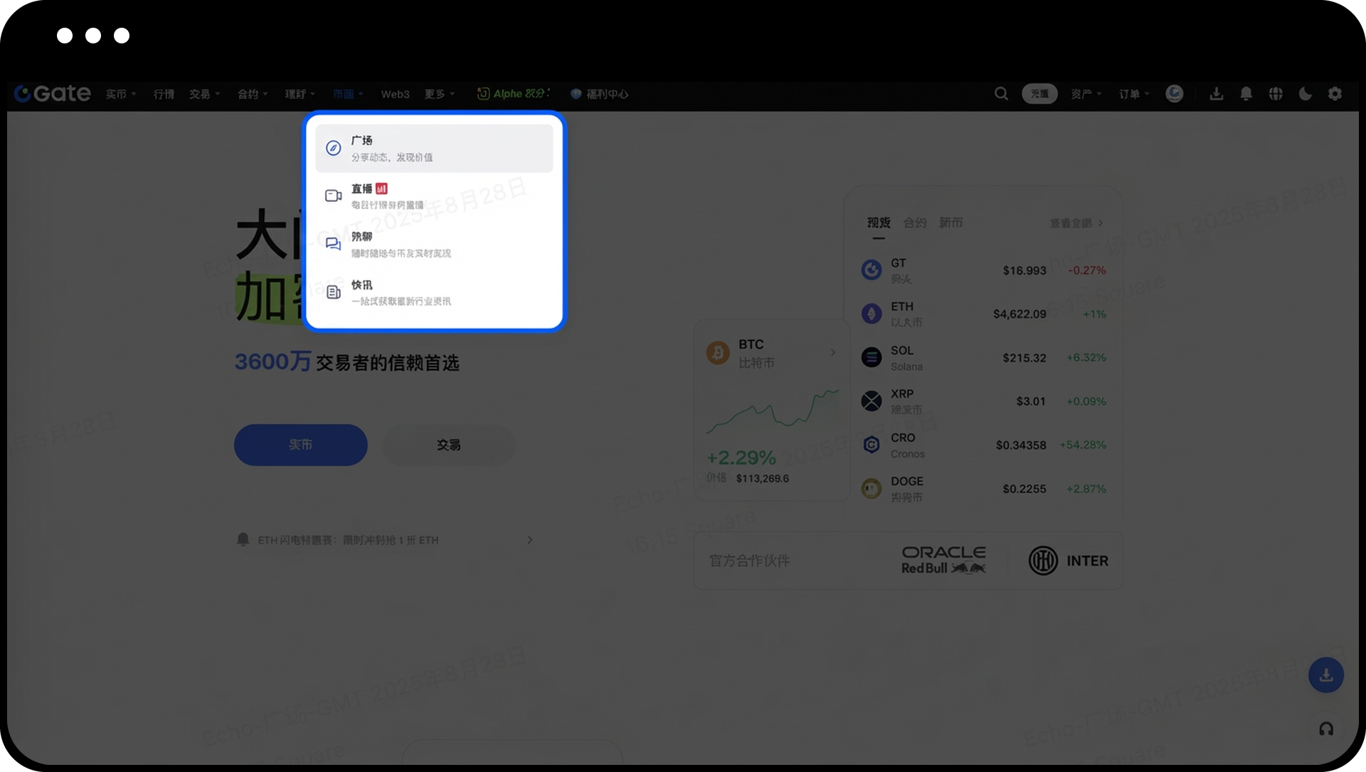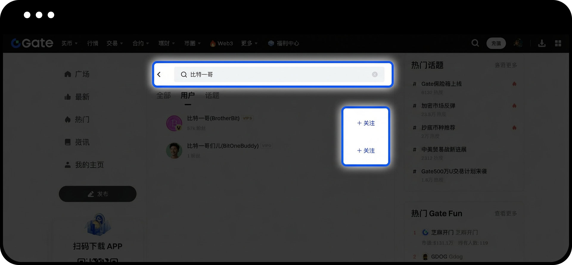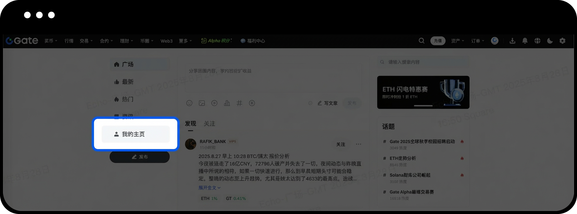 - 登录 Gate 个人账户,点击顶部导航栏【币圈】-【广场】
