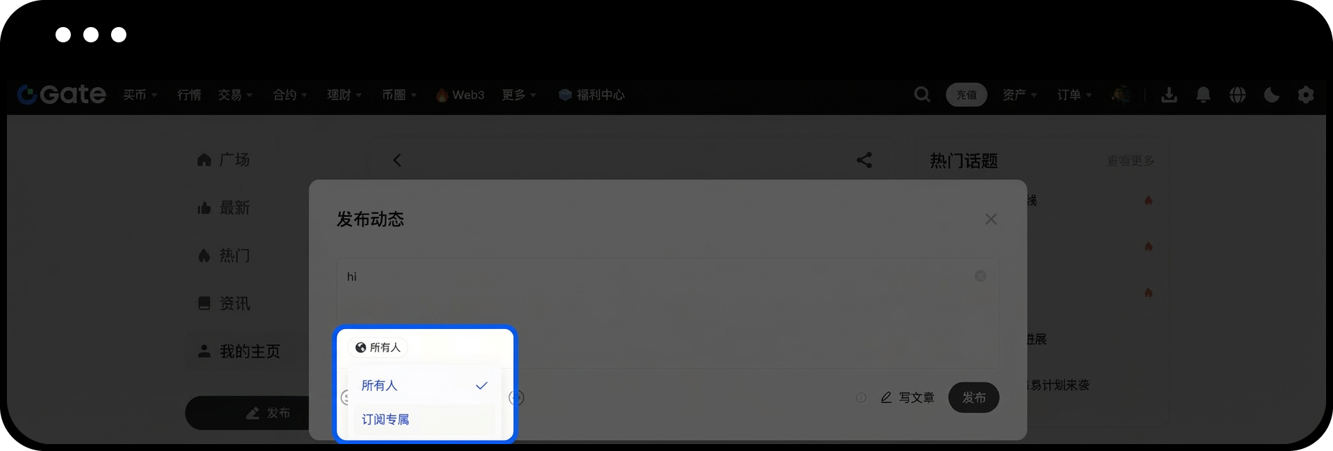 在发布广场动态时,点击可见范围【所有人】选项,勾选【订阅专属】,即可将内容设置为订阅用户专属可见
