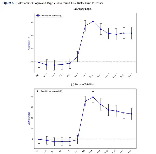 事件研究(Figure 4)提供了直接证据支持“学习—熟悉度机制”。在用户首次购买风险基金(t=0)前,处理组与对照组在Alipay登录次数和财富页访问次数上几乎一致,确认匹配有效。然而在t=0之后,两者出现巨大差异:Alipay登录量从约10激增至接近40,而财富页访问量从0附近跃升至40左右,并在随后的数月保持在显著更高水平。这种持续性的行为改变表明,用户在首次投资后会主动增加与平台的交互,强化信息获取、深入了解产品,证明“FinTech提升金融素养→促进参与”的机制成立。