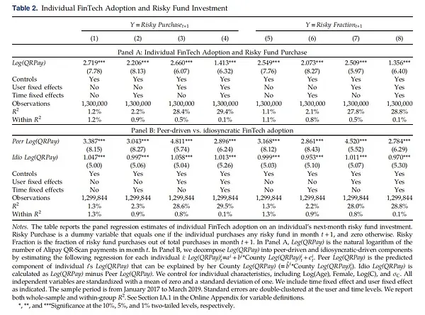 接着,该研究介绍了金融科技采用程度的测量方法,并以2017-2019年中国二维码支付的快速扩张为背景,构建了个体层面的FinTech使用指标QRPay。借助蚂蚁集团的账户级数据,研究能够精确追踪用户从数字支付向投资行为的迁移路径。进一步的实证分析显示,更高频的数字支付显著提升了用户投资风险基金的可能性,而通过同伴效应与地理距离等工具变量的识别,论文为这一关系提供了坚实的因果证据。