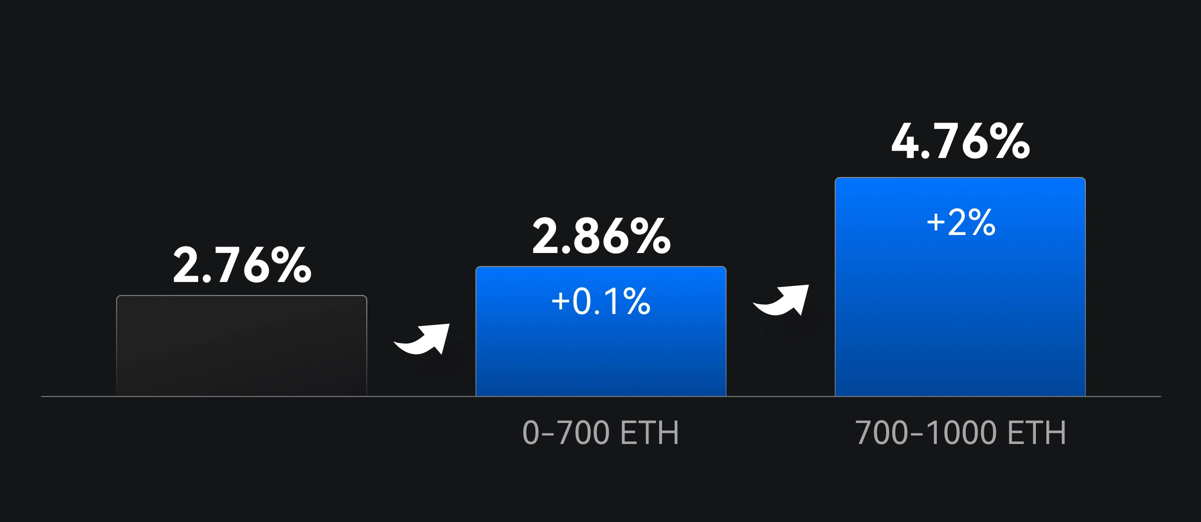 Стейкинг ETH на Gate в настоящее время предлагает до 5% APR, с бонусом, покрывающим лимит в 1,000 ETH на пользователя. Минимальный порог инвестиций составляет всего 0.00000001 ETH. Без какого-либо периода выкупа легко ориентироваться в рыночных колебаниях и зарабатывать на цепочке с помощью одного клика.