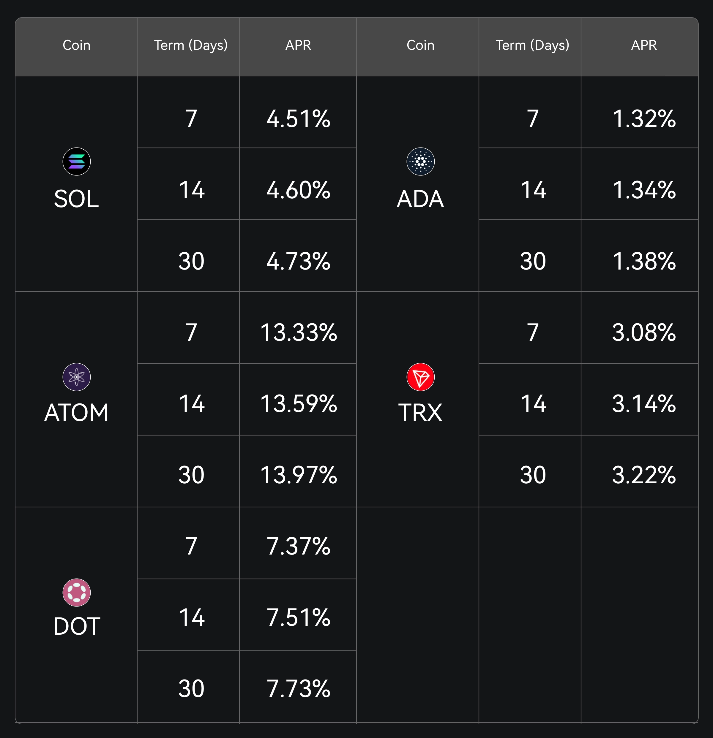 SOL, ADA, ATOM, TRX, DOT Fixed Term Now Available