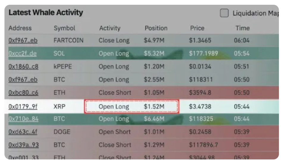مستثمرين كبار يواصلون بناء مراكز، ينقلون إشارة قوية في الوقت نفسه، أشار العديد من المحللين إلى أن حيتان XRP قد بدأت مؤخرًا في بناء مركز كبير. كشف محلل منصة X، KingXRP، أن مستثمرًا كبيرًا قد افتتح مركز شراء بقيمة 1.52 مليون دولار عندما كان السعر حوالي $3.44، مع هدف مباشر نحو خطة دمج RealFi القادمة. يُقال إن هذه الدمج قد يتيح لـ XRP Ledger الوصول إلى فرصة سوق مالية حقيقية (RealFi) تصل قيمتها إلى 6.5 تريليون دولار.