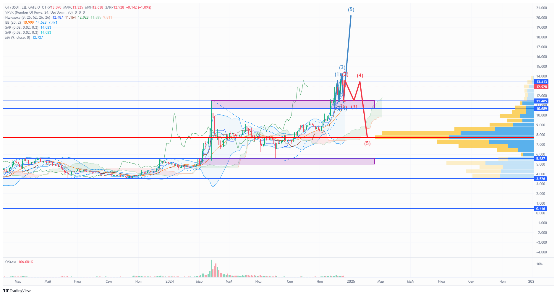 يظهر GT إمكانات صعودية قوية ، خاصة إذا تماسك فوق \ 13.413 دولار. يدعم هيكل الموجة إمكانية الانتقال إلى \ $ 16000 ، ولكن قبل ذلك ، من المنطقي توقع تصحيح طفيف. بالنسبة للمستثمرين على المدى الطويل ، تبدو منطقة 12000 دولار واعدة للدخول بأقل قدر من المخاطر.