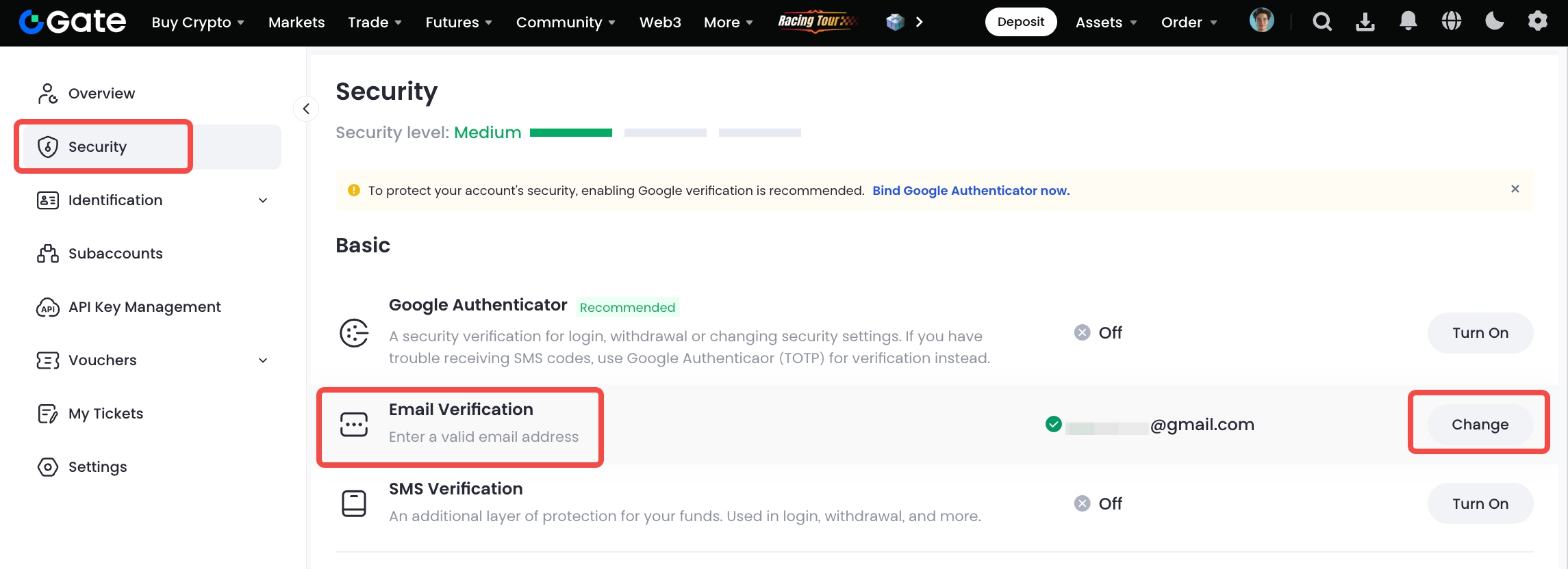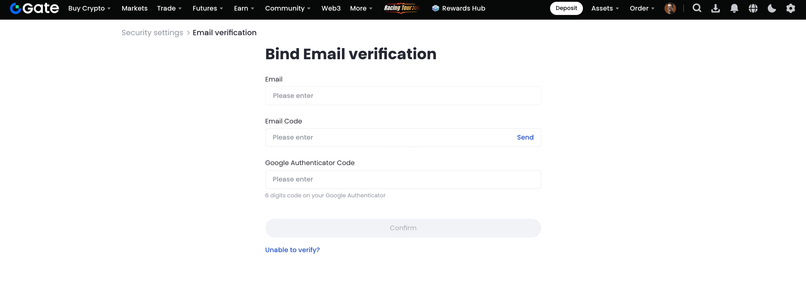 Comment lier une adresse email à votre compte Gate sur le site web :