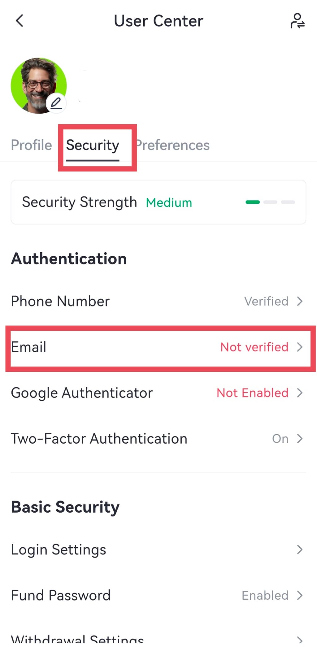 Ouvrez votre application mobile Gate et connectez-vous à votre compte. Cliquez sur l'icône de profil en haut à gauche, puis cliquez sur « Profil et paramètres »,allez jusqu'à « Centre de sécurité » > « Email ».