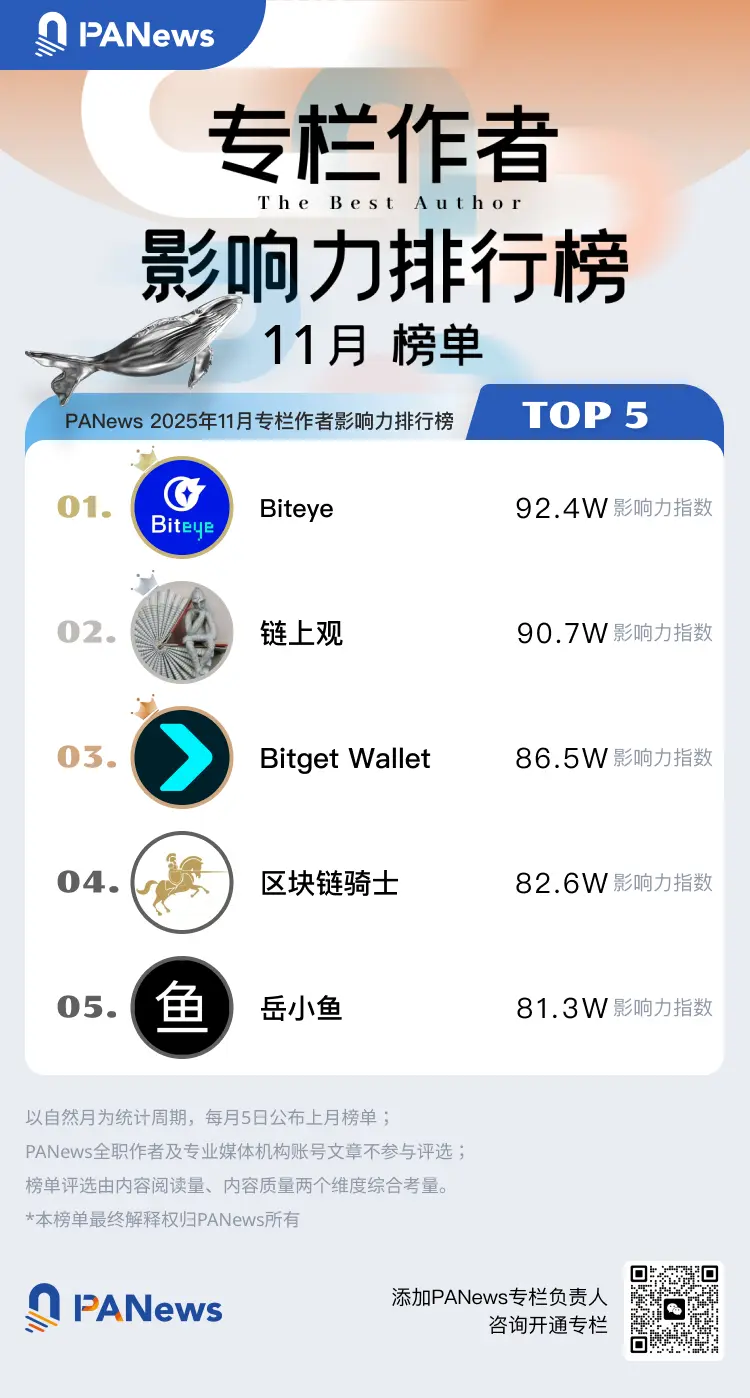 Le classement de l'influence des auteurs de colonnes et de la popularité des articles de colonnes de PANews pour novembre 2025 est publié.