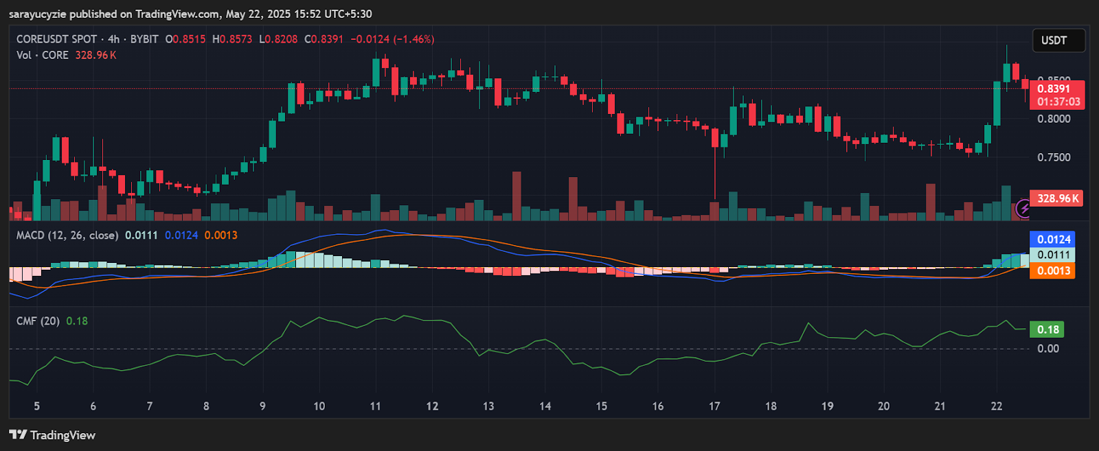 Pada saat berita ini diterbitkan, CORE diperdagangkan di level $0.8375, dengan kapitalisasi pasar sebesar $839 juta. Selain itu, volume perdagangan harian aset ini telah melonjak lebih dari 216%, mencapai $60.33 juta, menurut data CoinMarketCap.