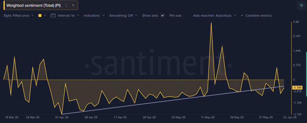 ! Data PI On Chain Selain itu, sentimen berbobot, yang sebelumnya meningkat, setelah kejatuhan pertengahan Mei, telah menurun menjadi “-0.398”. Ini menunjukkan bahwa orang lebih banyak berbicara negatif daripada positif.