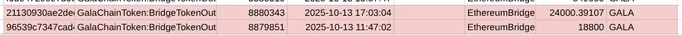 Mengambil contoh penarikan mencurigakan pertama, yang terjadi pada 13 Oktober pukul 15:55 UTC, transaksi di sekitarnya sebesar 18.800 dan 24.000 GALA tercatat dalam data GalaScan.