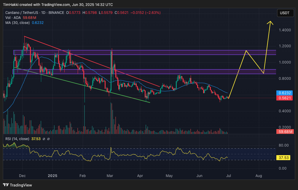 市場予測によると、ADAの価格は現在の0.5612ドルから年中約2ドルに上昇する可能性があります。より楽観的なモデルでは、ADAは全面的に3.09ドルの歴史的高値に回帰し、2021年9月のピーク以来82%の大幅下落から回復する可能性があると考えられています。現在のレベルでの強力なサポートと、11月から4月にかけて現れるブルフラッグパターンは、今後数ヶ月の持続的成長の堅固な基盤を示唆しています。さらに、$ADAのRSIは過剰売却に近く、37.5であり、まだ下降中です。もしRSIが30に下落すれば、一時的な再蓄積が発生し、価格を押し上げる可能性があります。