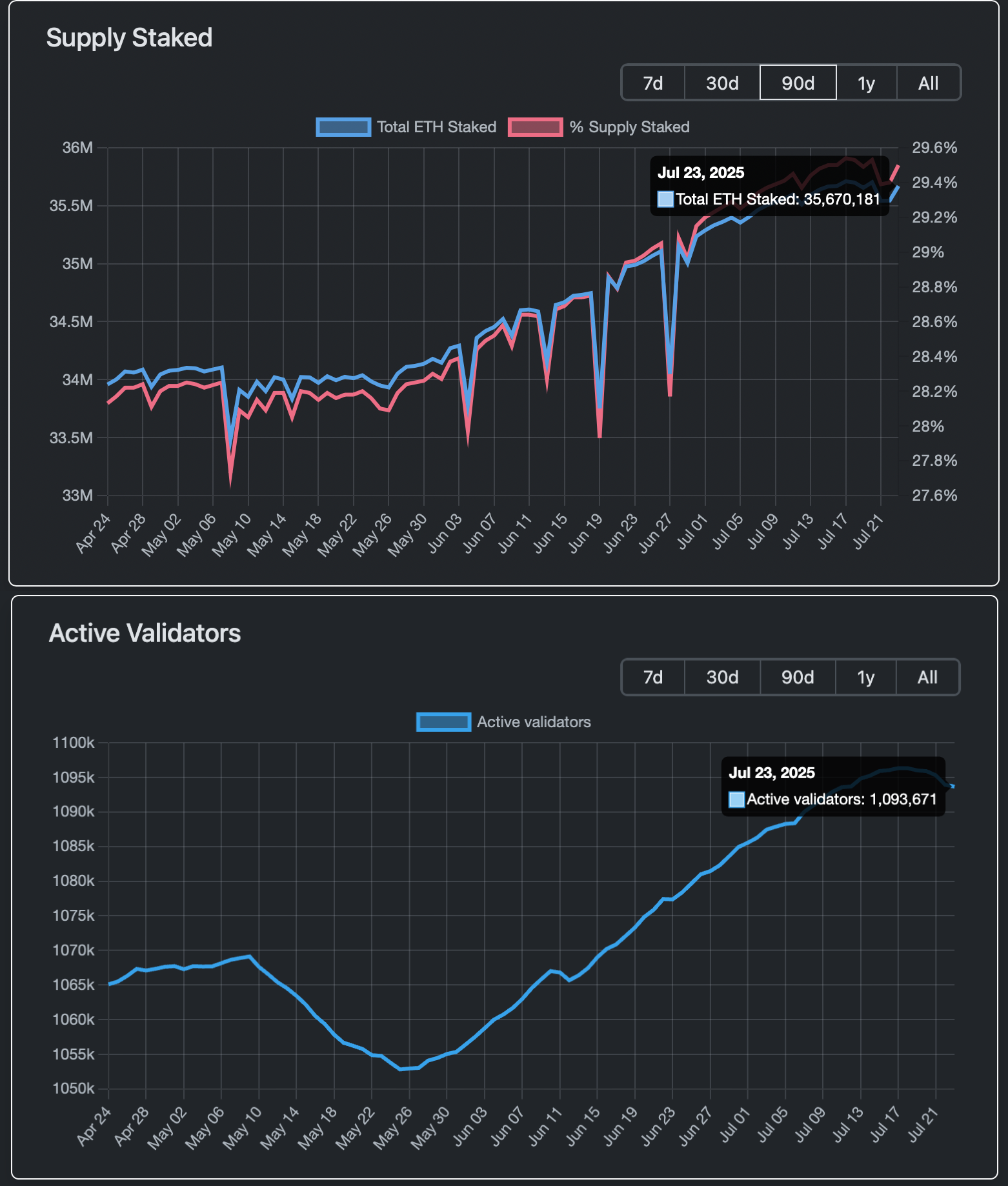 混乱の中、イーサリアム上で活躍するバリデータの数は過去数週間で大幅に増加しましたが、木曜日のピーク 1,096,339 から 1,093,671 に減少しました。注目すべきは、発稿時点でイーサリアムネットワークのステーク量が 3,567 万 ETH であることです。