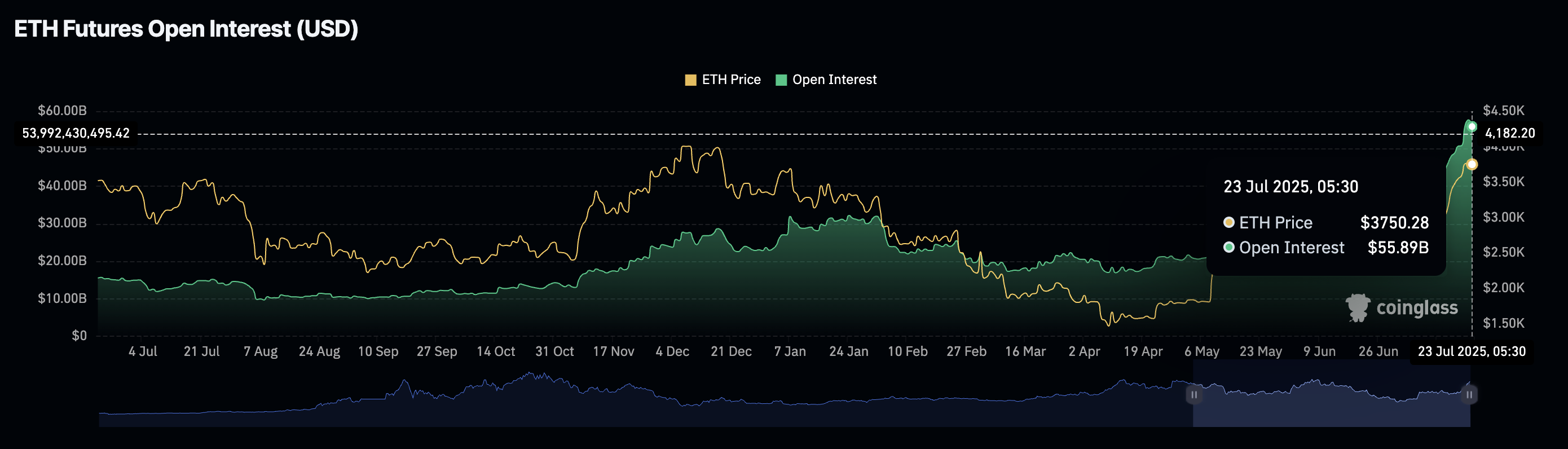さらに、Coinglassのデータによると、ETHの未決済建玉(OI)は558.9億ドルで、火曜日に記録された576.9億ドルの歴史的高値に近づいています。