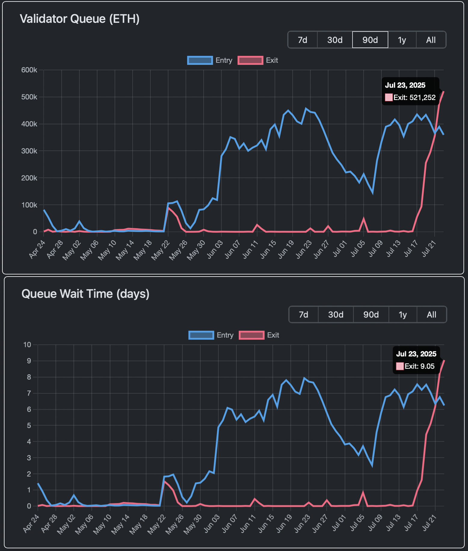 Validator Queue のデータによると、ネットワークからの退出を待っている ETH の量が先週の 1,920 ETH から 521,252 ETH に増加し、価値は 195 億ドルに達しました。大量の ETH がネットワークからの退出を待っているため、水曜日の待機時間は 9 日を超え、先週はわずか 0.03 日でした。