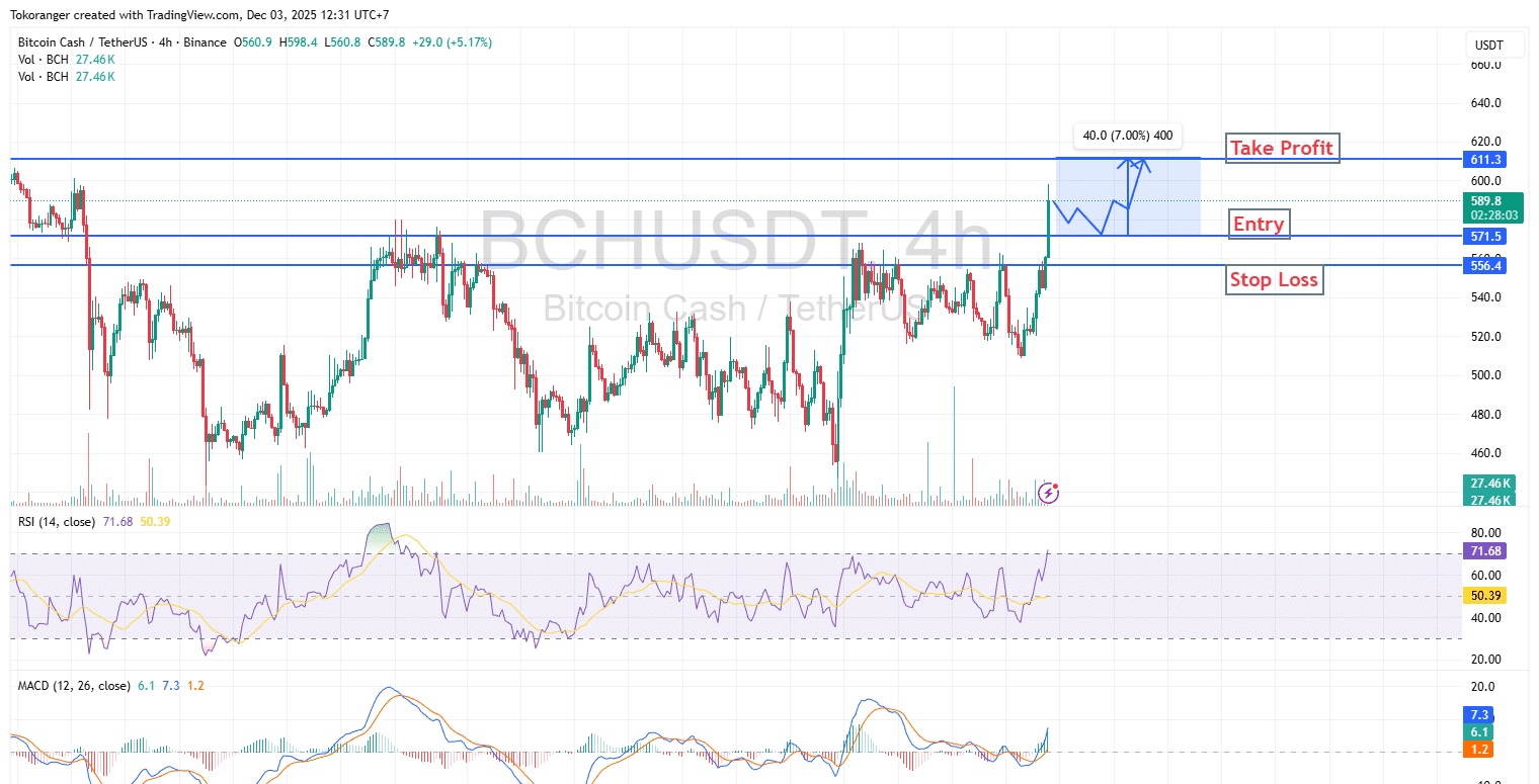 Source: TokocryptoBlog Original Title: Market Sinyal Kripto: Analisis Teknikal dan Peluang 3 Desember 2025 Original Link: ## 仮想通貨デイリーマーケットシグナル2025年12月3日(水)のための詳細な分析と取引戦略の推奨事項で、顕著な価格変動の可能性を示す3つの仮想通貨資産をカバーします。この情報は最新の市場データとテクニカル指標に基づいて作成されており、仮想通貨市場の絶え間ない変化の中でトレーダーがより正確な意思決定を行うのに役立ちます。## 過去24時間で発生した出来事### トランプ氏、ケビン・ハセットを「FRB議長候補」と発表トランプ大統領はホワイトハウスでの発表で、ケビン・ハセットを連邦準備制度理事会(FRB)議長の有力候補として正式に指名しました。**影響:** 市場はこれを、今後の米国金融政策の方向転換のシグナルとして評価しています。### テキサス州、米国初の州として国家投資ファンドのためにビットコインを購入TEXAS BREAKING: テキサス州は、SB 21ビットコインリザーブの新方針の一環として、BlackRock IBIT ETF経由で$5 百万ドル相当のBTCを購入。**影響:** ビットコインの米政府機関での正統性がさらに高まりました。### TrustWallet、「Native Predictions」機能を開始TrustWalletは、MyriadMarketsを利用したPredictions機能をリリースしました。PolymarketとKalshiもまもなく統合予定です。**影響:** TWTのユースケースが拡大し、Web3ユーザーのエンゲージメントが向上します。### バンガード、現物型暗号資産ETF取引を正式許可これまで暗号資産に消極的だったバンガードが、今や5,000万以上の顧客向けにビットコイン、イーサリアム、XRP、ソラナの現物ETF取引を開放。**影響:** 超強気、世界で最も保守的な金融機関による大きな方針転換です。### 日本政府、暗号資産利益に一律20%課税を提案日本政府は、株式・投資信託と同様に暗号資産の利益に一律20%の課税を計画。**影響:** ポジティブで、国内の暗号資産取引を促進し、税務コンプライアンスも容易化します。取引やトレードの意思決定を行う際は、必ず総合的な分析を行ってください。## 3つの仮想通貨資産のテクニカル分析### BCH/USDT (🔼 +7.01%)**エントリー:** $571.5 **ストップロス:** $556.4 **テイクプロフィット:** $611.3BCHは現在、$556〜$571の需要エリアから力強く反発し、きれいなリバイバルパターンを示しており、買い手が主導権を取り始めていることを示しています。価格構造は新たなハイヤーローの連続を形成し、RSIは70を突破して短期的な強気モメンタムを確認しています。ただし、価格が再び弱含み$556エリアを割り込む場合はこの強気シナリオは無効となるため、ストップロスによるリスク管理が重要です。### CETUS/USDT (🔼 +6.71%)**エントリー:** $0.0290 **ストップロス:** $0.0279 **テイクプロフィット:** $0.0309CETUS/USDTは現在、$0.0279〜$0.0290の需要ゾーンから力強く反発し、「リバウンド」の様相を見せています。買い手が市場を再び支配し始めており、急速な上昇で$0.0307エリアおよびレンジのミッドポイントを突破したことでモメンタムの変化が明確に。RSIも買われすぎゾーンまで上昇しており、新たな強気の勢いが感じられます。### ACT/USDT (🔼 +9.55%)**エントリー:** $0.0224 **ストップロス:** $0.0213 **テイクプロフィット:** $0.0245ACT/USDTは、$0.0213の需要エリアから力強く反発し、ミッドレンジの$0.0224を再び突破したことで、現在は十分健全な状態です。このレベルは新たなサポートへと転換しています。直近の上昇キャンドルでの出来高急増は買い手の主導を裏付けており、RSIも上昇傾向にあるものの買われすぎゾーンに近づいており、価格が一時的に横ばいになる可能性を示唆しています。---**免責事項:** 仮想通貨資産への投資は高リスクを伴い、本コンテンツに基づく投資判断、推奨、リサーチおよび情報に基づくすべての投資決定の責任はご自身にあります。いかなる機関または国家当局もこれら投資リスクに対して責任を負いません。本コンテンツは情報提供のみを目的としており、売買を勧誘するものではありません。