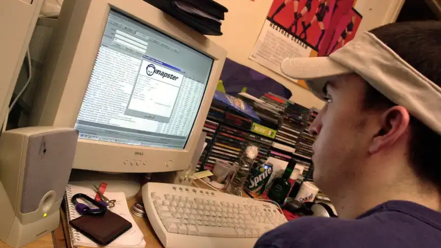 ニューヨーク大学の学生がニューヨークでNapsterのウェブサイトから音楽ファイルをダウンロードしている様子。2003年9月8日、米国レコード協会(RIAA)は、インターネットを通じて音楽ファイルをダウンロードした261人のファイル共有者に対して訴訟を提起しました;また、RIAAはインターネットサービスプロバイダーに1500件以上の召喚状も送付しています。