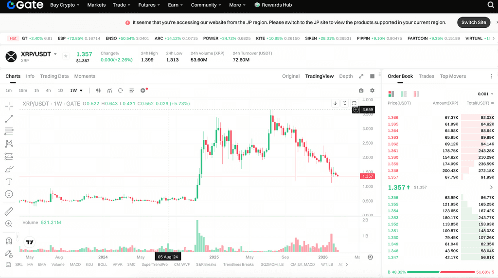 オンチェーンの活発さと対照的なのが、最近のXRPの価格動向です。Gateの市場データによると、2026年2月25日時点でXRPの価格は1.357ドル、24時間の取引高は7260万ドルです。過去24時間で+2.26%上昇した一方、過去30日間では-26.84%下落し、時価総額は835億ドル、マーケットシェアは5.77%を維持しています。