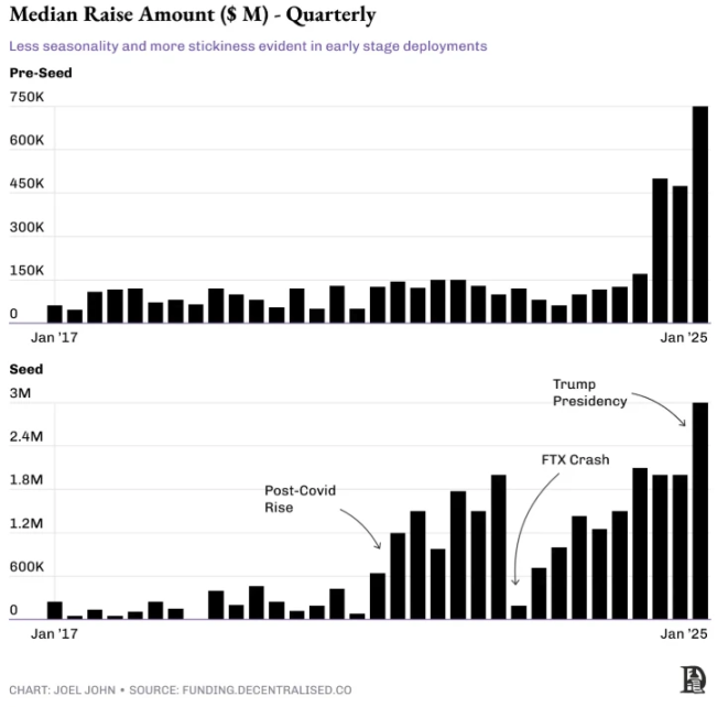 資金調達の拡大は、企業が初期段階でより高い(または希薄化された)評価を受けることを意味し、これは企業が将来、リターンを提供するためにより高い評価が必要であることも意味します。トランプが当選した数ヶ月後、シードラウンドの資金調達データも大幅に増加しました。私の理解では、トランプの就任はファンドのGP(一般パートナー)が資金を調達する環境を変え、ファンド内のLPやより伝統的な配置者の関心が高まり、初期企業へのベンチャーキャピタルの好みに転換されたということです。