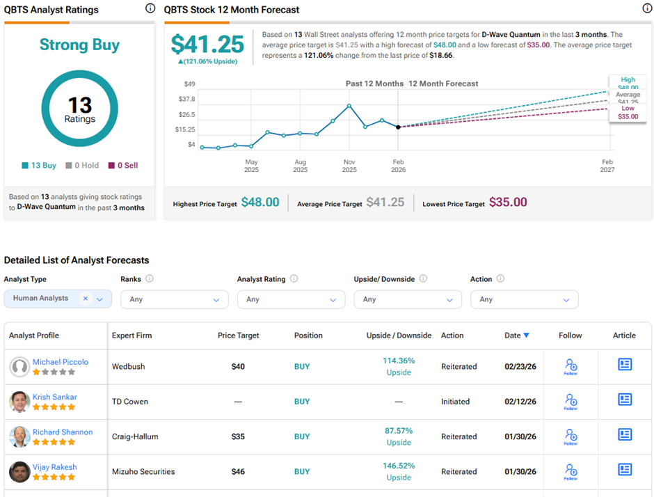 Analysts remain highly optimistic about D-Wave’s long-term prospects. On TipRanks, QBTS stock has a Strong Buy consensus rating based on 13 unanimous Buys. The average D-Wave Quantum price target of $41.25 implies 121% upside potential from current levels.