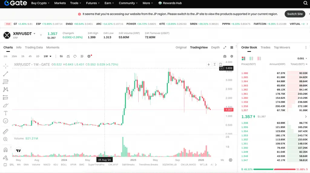 Contrasting sharply with on-chain activity is XRP’s recent price performance. According to Gate.io data, as of February 25, 2026, XRP was priced at $1.357, with a 24-hour trading volume of $72.6 million. Despite a +2.26% increase in the past 24 hours, over the past 30 days XRP has declined by -26.84%. Its market cap remains at $83.53 billion, with a market share of 5.77%.