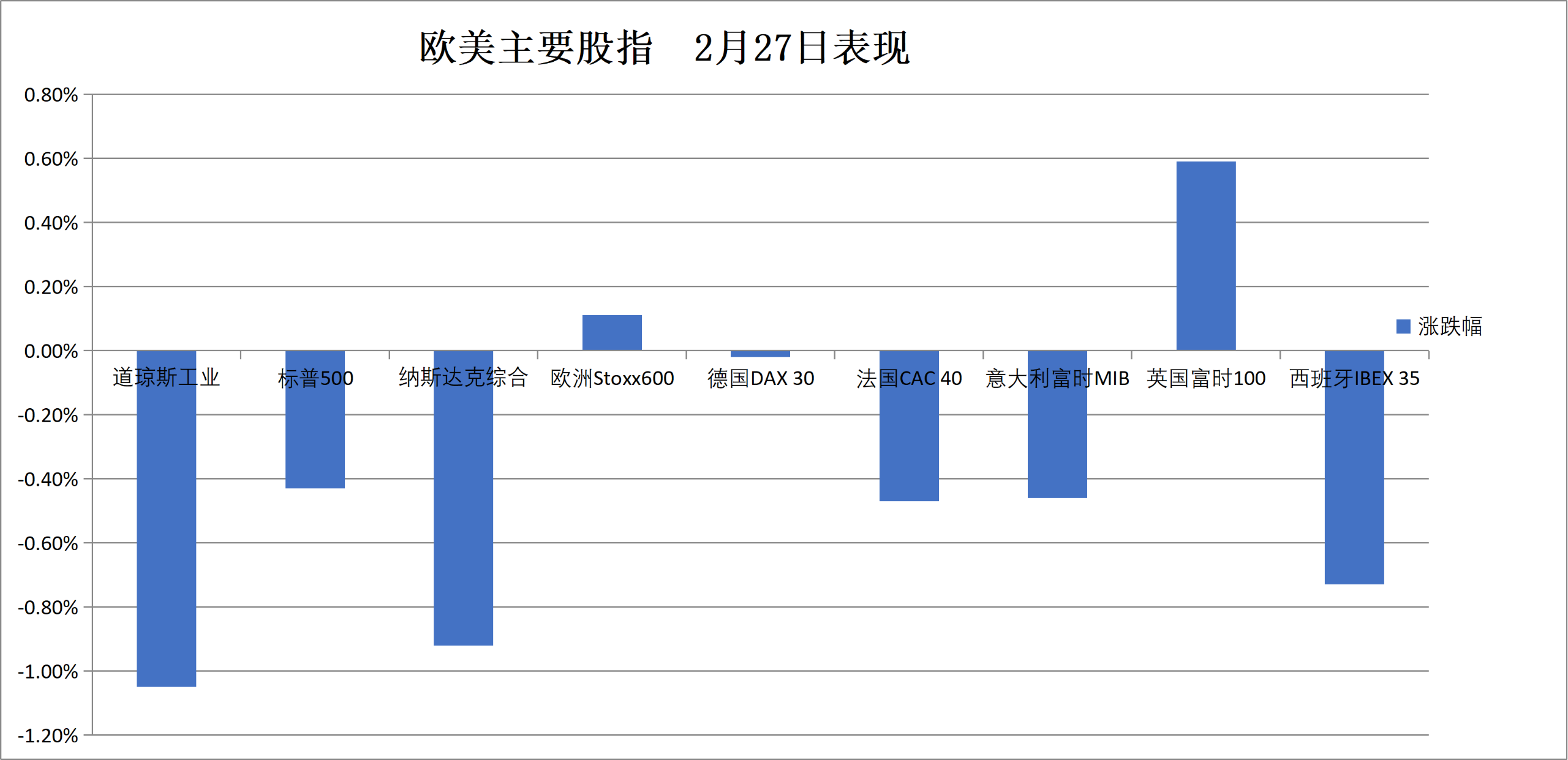 • Euro Stoxx 50 down 0.38%, at 6138.41; weekly up 0.12%, February up 3.20%.