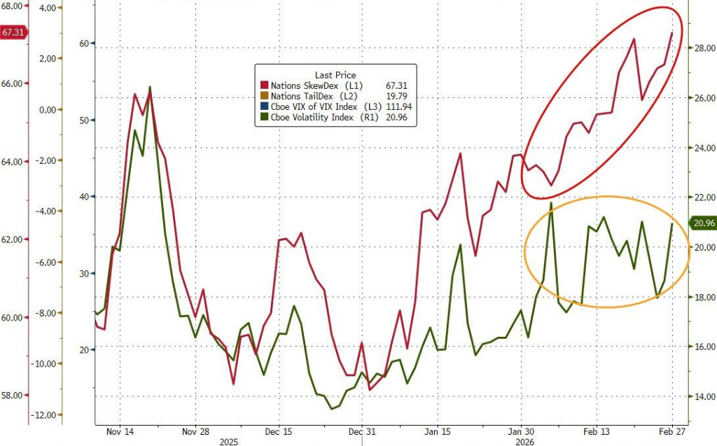 Although the VIX index only returned to 21 in February, the skewness surged to its highest level since October 2025, as hedgers flooded the market seeking downside protection.