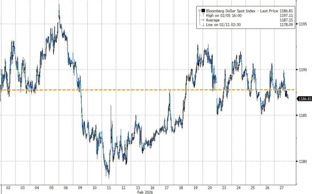 • Bloomberg dollar index down 0.09% at 1186.93. February down 0.11%, trading range 1197.11–1178.09.