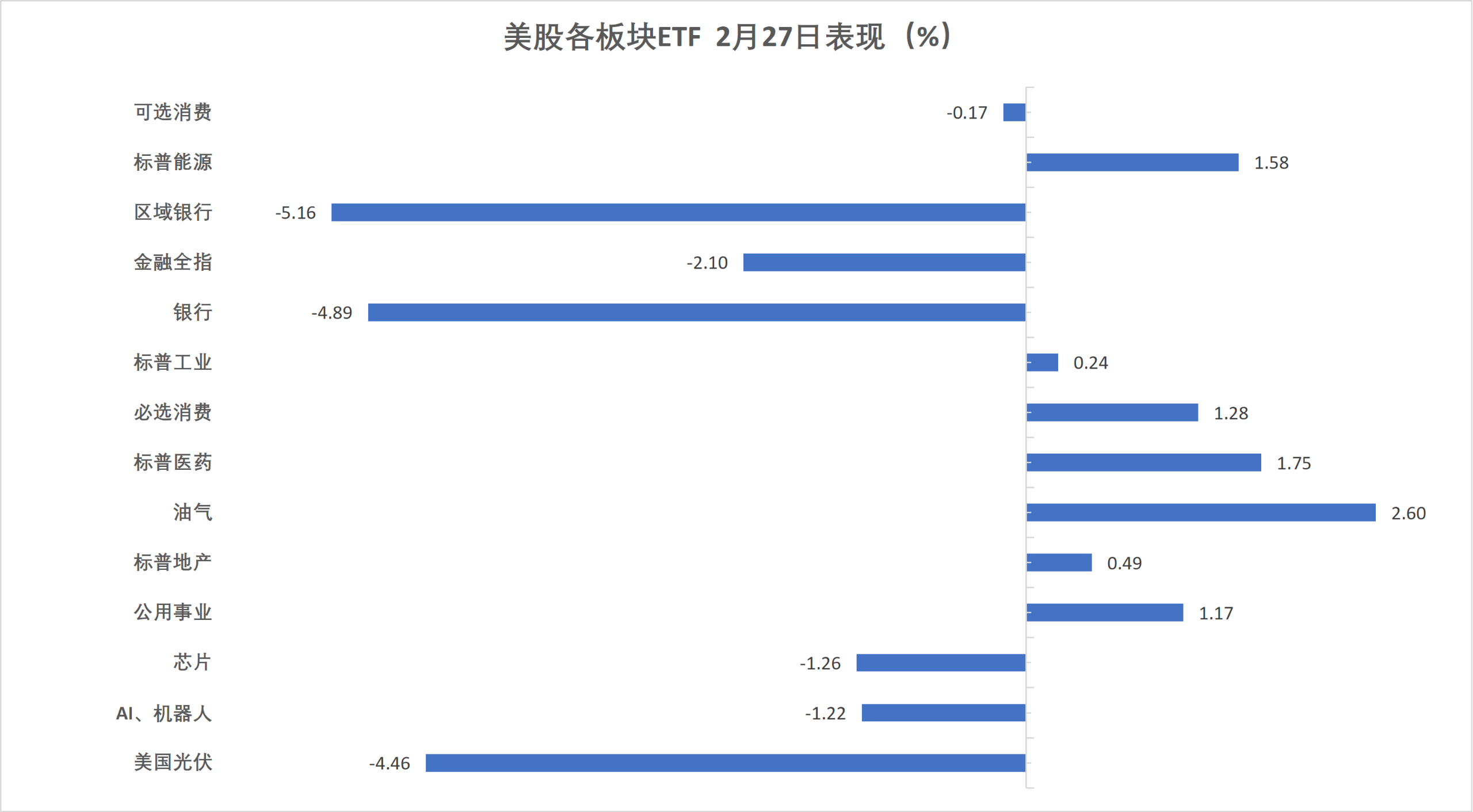 • Banking sector plunged, with the S&P Regional Bank ETF down over 5%, KBW Bank ETF down 4.89%. Solar ETF dropped 4.46%. Oil & gas sector rose 2.60%.