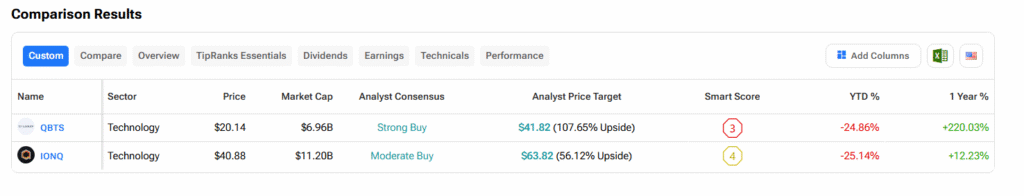 According to the TipRanks Stock Comparison Tool, analysts still rate QBTS a Strong Buy with an average price target of about $41.82, implying significant upside. Meanwhile IonQ carries a Moderate Buy consensus with an average price target near $63.82, implying roughly 56% upside from current levels.