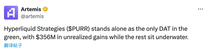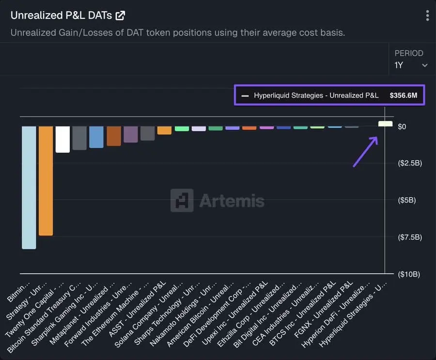 As the market recovered and HYPE prices rebounded, Artemis data showed that Hyperliquid Strategies ($PURR) turned unrealized losses into gains, reaching $356 million in unrealized profits, officially making it the only profitable player in the DAT sector.